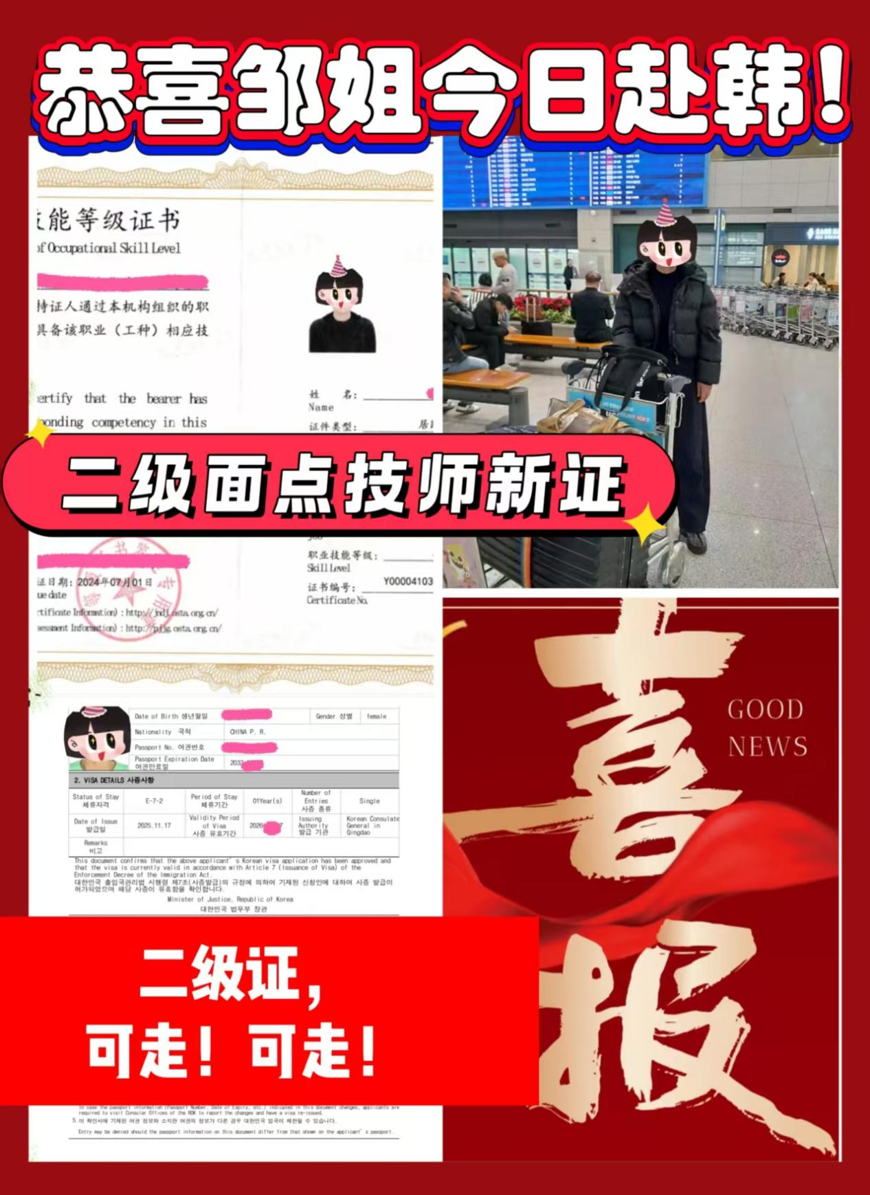近日,公司再傳捷報(bào):來自沈陽(yáng)的面點(diǎn)師鄒女士憑借二級(jí)技師證,僅用短短數(shù)天便成功獲批韓國(guó) E-7-2 工作簽證,即將入職大田甜蜜北京(化名),月薪達(dá) 260 萬(wàn)韓元(約合人民幣 1.25 萬(wàn)元),開啟三年海外職業(yè)征程。